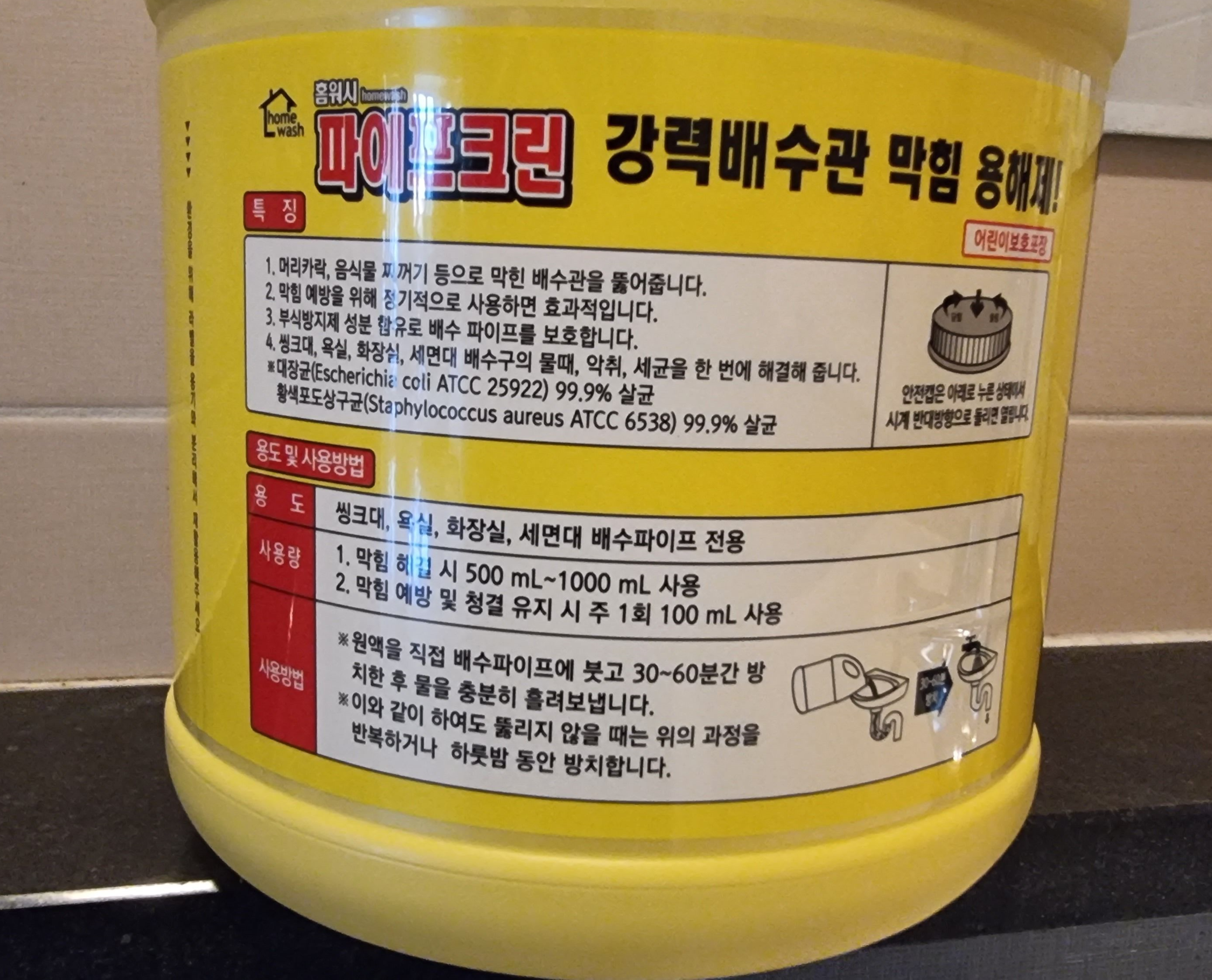 1회 사용할 때 원액 500cc~1,000cc를 넣으라고 되어 있고 1시간정도 방치한 후에 물을 충분히 흘려보내라고 한다. 그래도 뚫리지 않는다면 부어놓고 하룻밤 방치해야 한다. 그래도 뚫리지 않는다면? 업체를 불러야 한다. 금액은? 정말 겁나 비싸다.(이 글을 배수관 청소업체가 싫어합니다.)